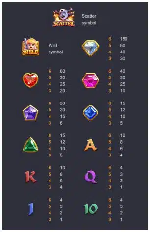 สัญลักษณ์ Scatterใช้แทนสัญลักษณ์ไวด์ และสำหรับใช้แทนสัญลักษณ์ทั้งหมดยกเว้น สัญลักษณ์ Scatter และ Scatter+1 ฟรีสปิน